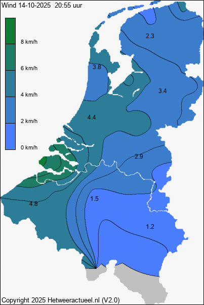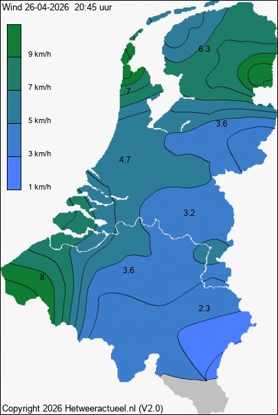 The map with the actual windspeed (10 minute average) is constructed 2 times per hour from the current data from all weather stations, provided that the data is less than 1 hour old.