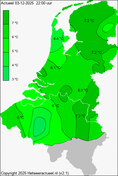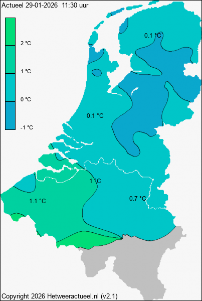 Het kaartje met de actuele temperatuur wordt iedere 10 minuten opgebouwd uit de actuele gegevens van alle weerstations, mits de data minder dan 1 uur oud is.