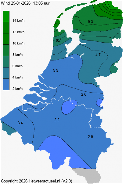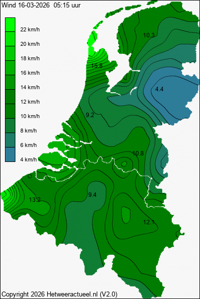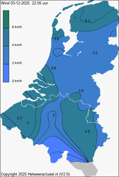 Het kaartje met de actuele wind windsneldheid (10 minuten gemiddelde) wordt 2 keer per uur opgebouwd uit de actuele gegevens van alle weerstations, mits de data minder dan 1 uur oud is.