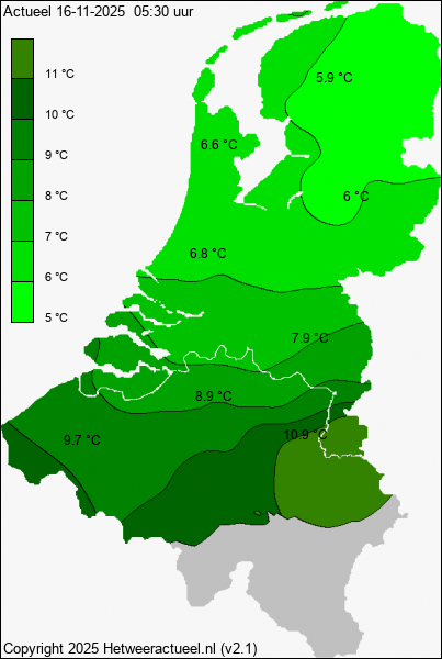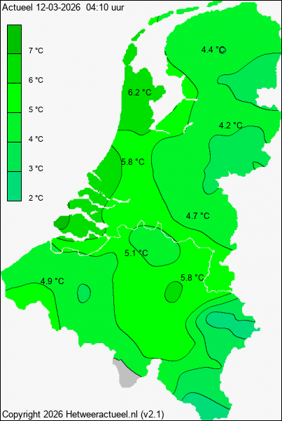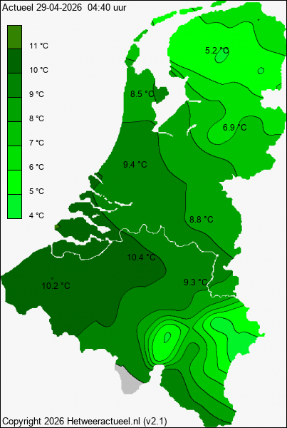 Het kaartje met de actuele temperatuur wordt iedere 10 minuten opgebouwd uit de actuele gegevens van alle weerstations, mits de data minder dan 1 uur oud is.