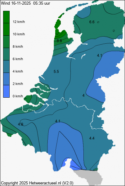 Het kaartje met de actuele wind windsneldheid (10 minuten gemiddelde) wordt 2 keer per uur opgebouwd uit de actuele gegevens van alle weerstations, mits de data minder dan 1 uur oud is.